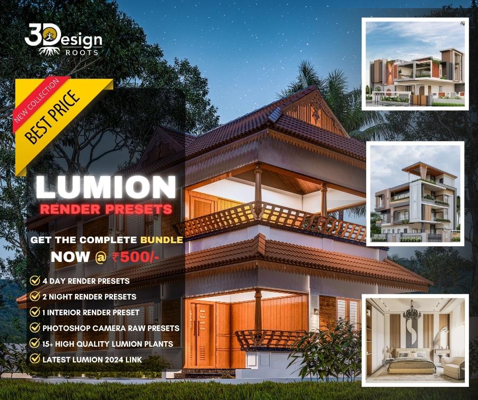 Transform your renders from ‘good’ to ‘photorealistic’ in minutes. This all-in-one bundle includes professional Day & Night Lumion presets, high-quality custom materials, curated 3D plants, and a complete Photoshop post-production kit (Skies + Camera Raw Filters). The exact workflow used by Three Design Roots for high-end client presentations.